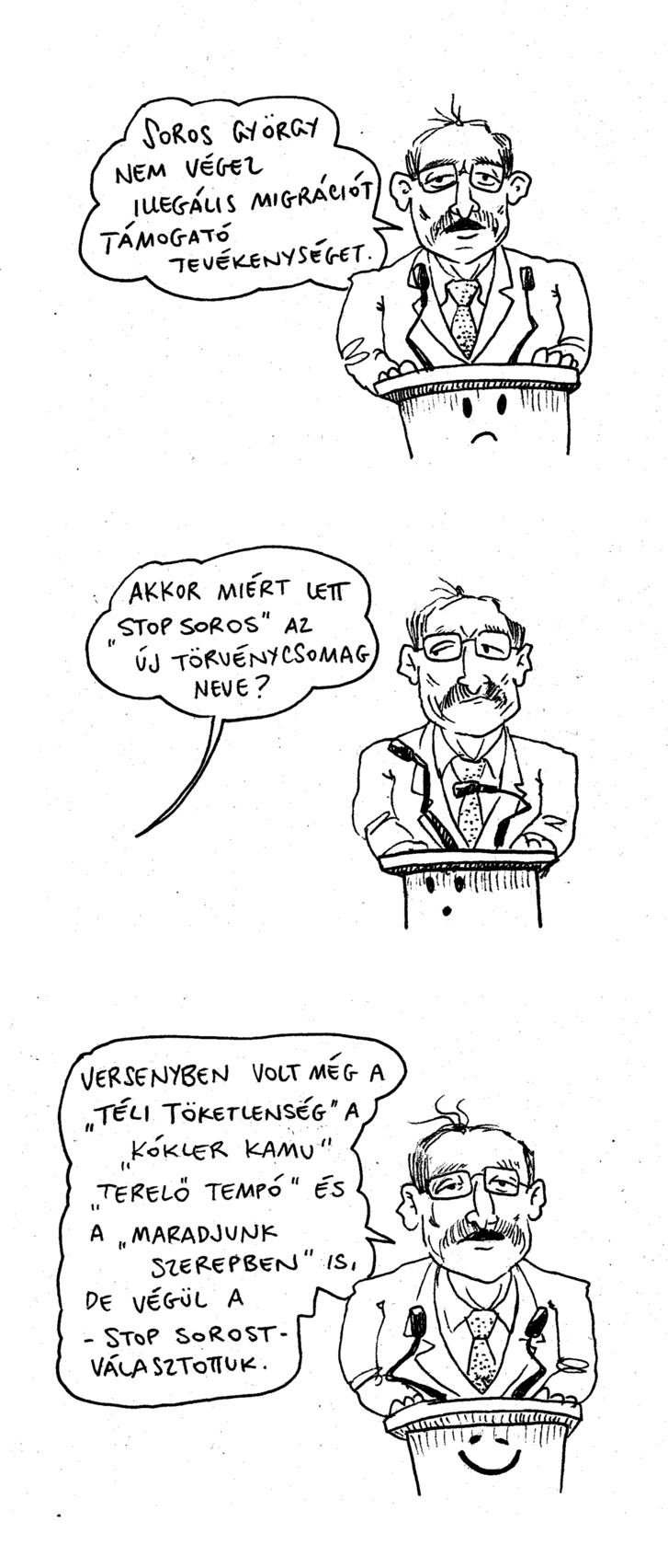 | 2018-01-18 | Soros György nem végez illegális migrációt támogató tevékeny...Soros György nem végez illegális migrációt támogató tevékenységet.Akkor miért lett "Stop Soros" az új törvénycsomag neve? Versenyben volt még a "Téli Töketlenség", a "Kókler Kamu", "Terelő Tempó" és a "Maradjunk Szerepben" is, de végül a - Stop Sorost - választottuk. | Csak előre menekülhetünk. nincs program nincs eredmény Soros...Csak előre menekülhetünk. nincs program nincs eredmény Soros van Pintér Sándor pult smile sajtótájékoztató lehetőségek https://index.hu/belfold/2018/01/17/soros_akcioterv_kormanyules/ |